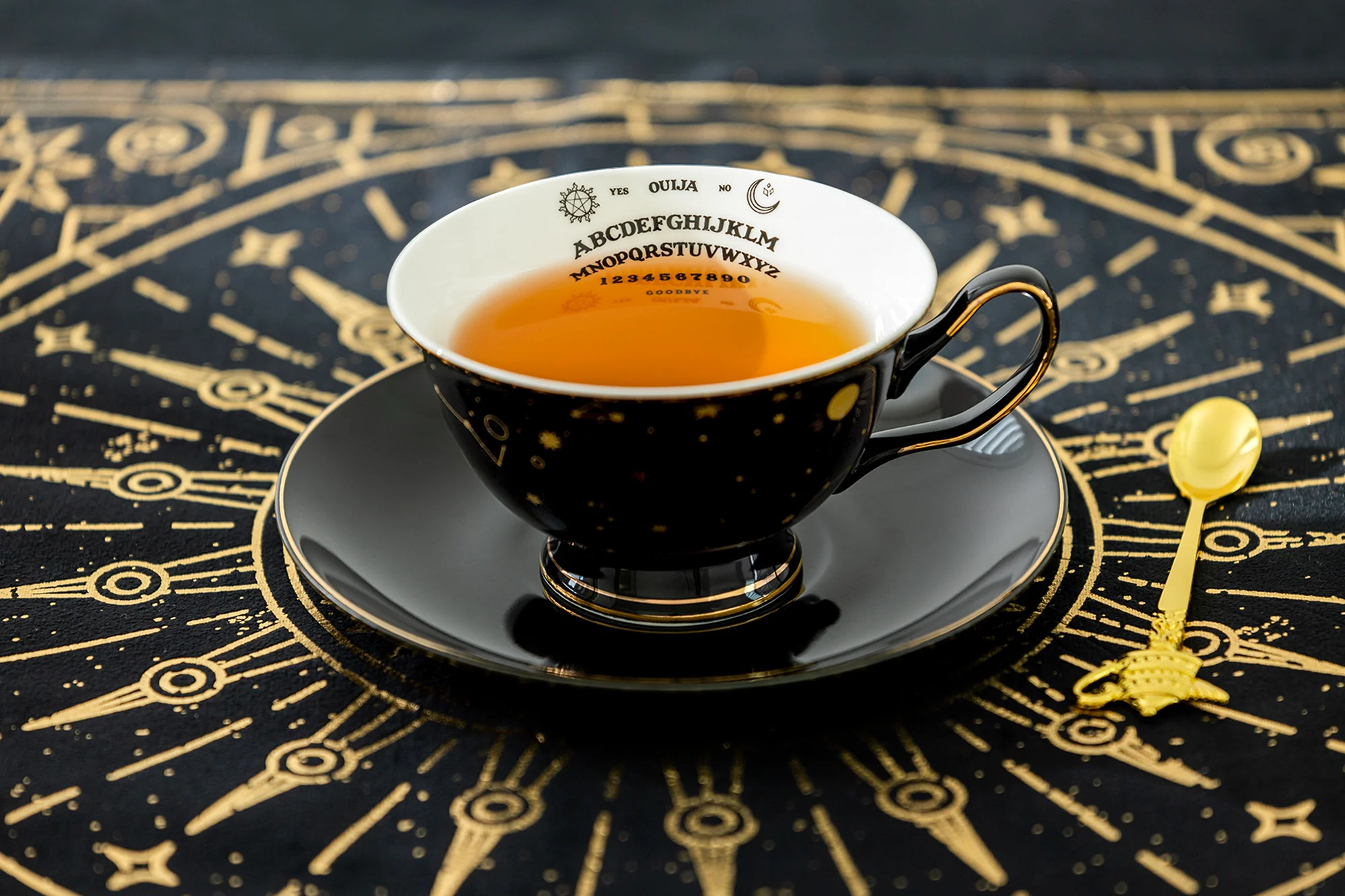 Black Gold Scallop Teapot + 4 Assorted Halloween Tea Cup and Saucer Sets - Ouija & Witchy Crystal Ball