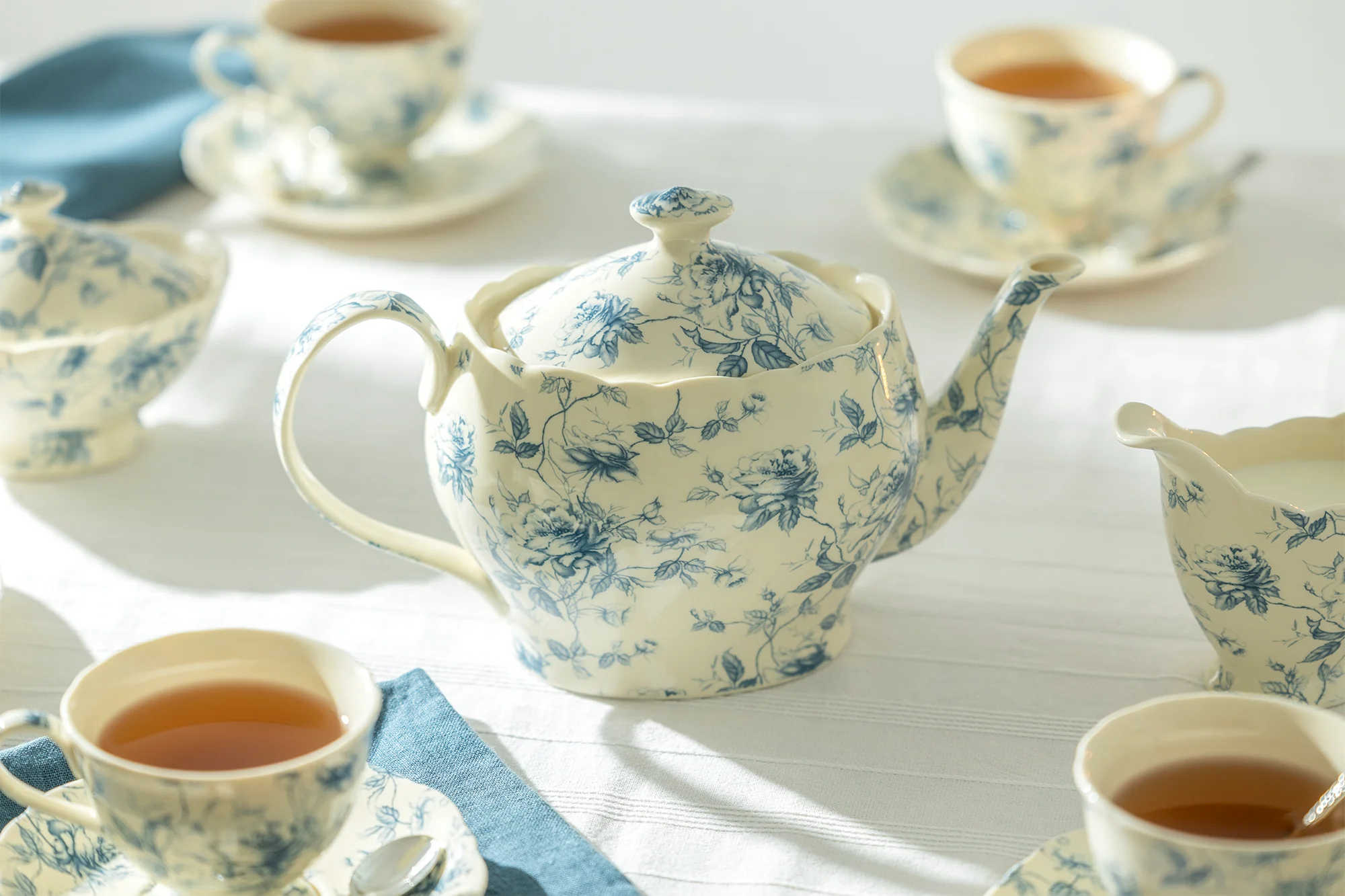 This tea set features the decal placed under the glaze. It has a base color of cream, rather than white. Each set includes - 1 teapot, 1 sugar bowl and 1 creamer, 4 cups with 4 saucers.
