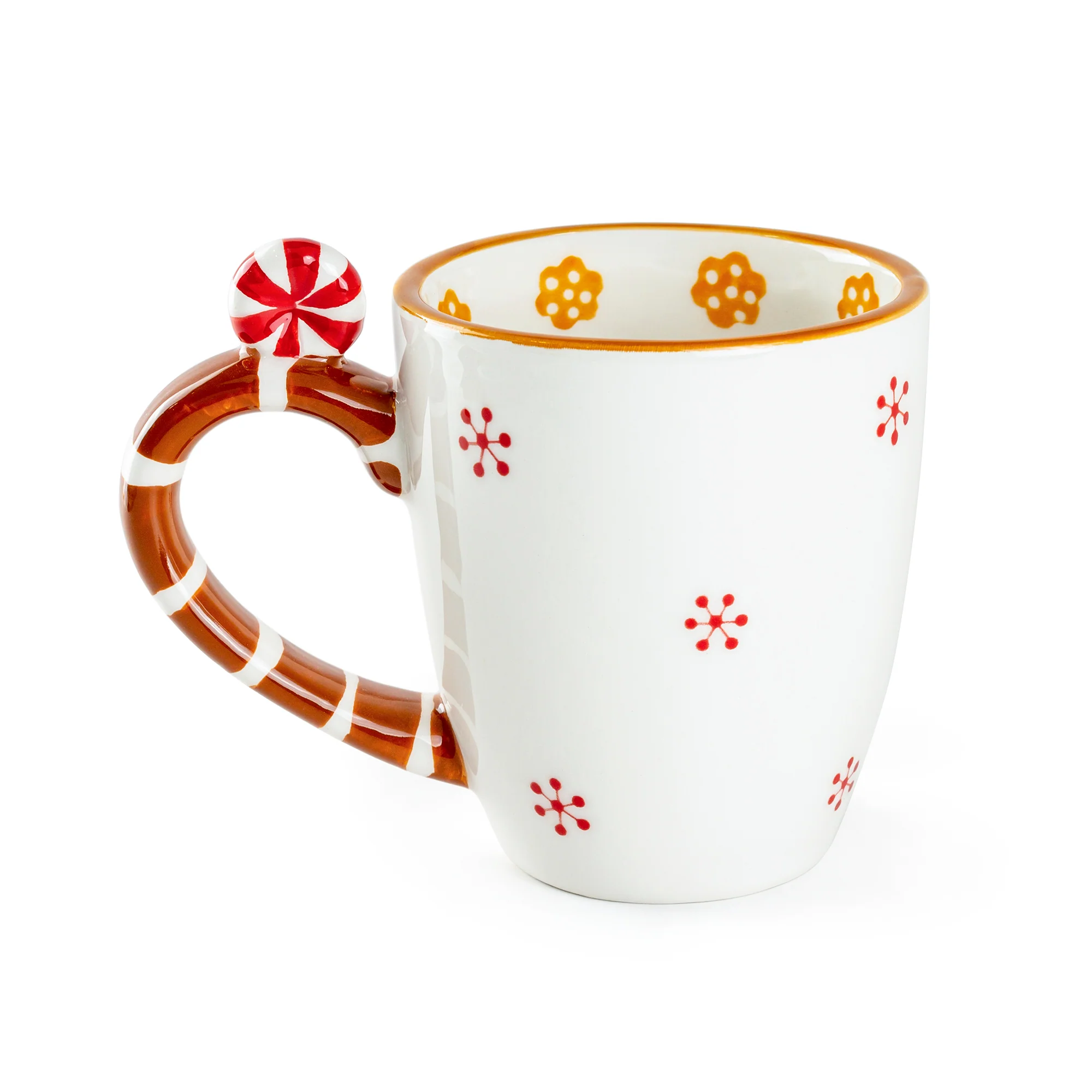 This mug is hand crafted and painted with relief snowman and three-dimensional peppermint candy on the handle.