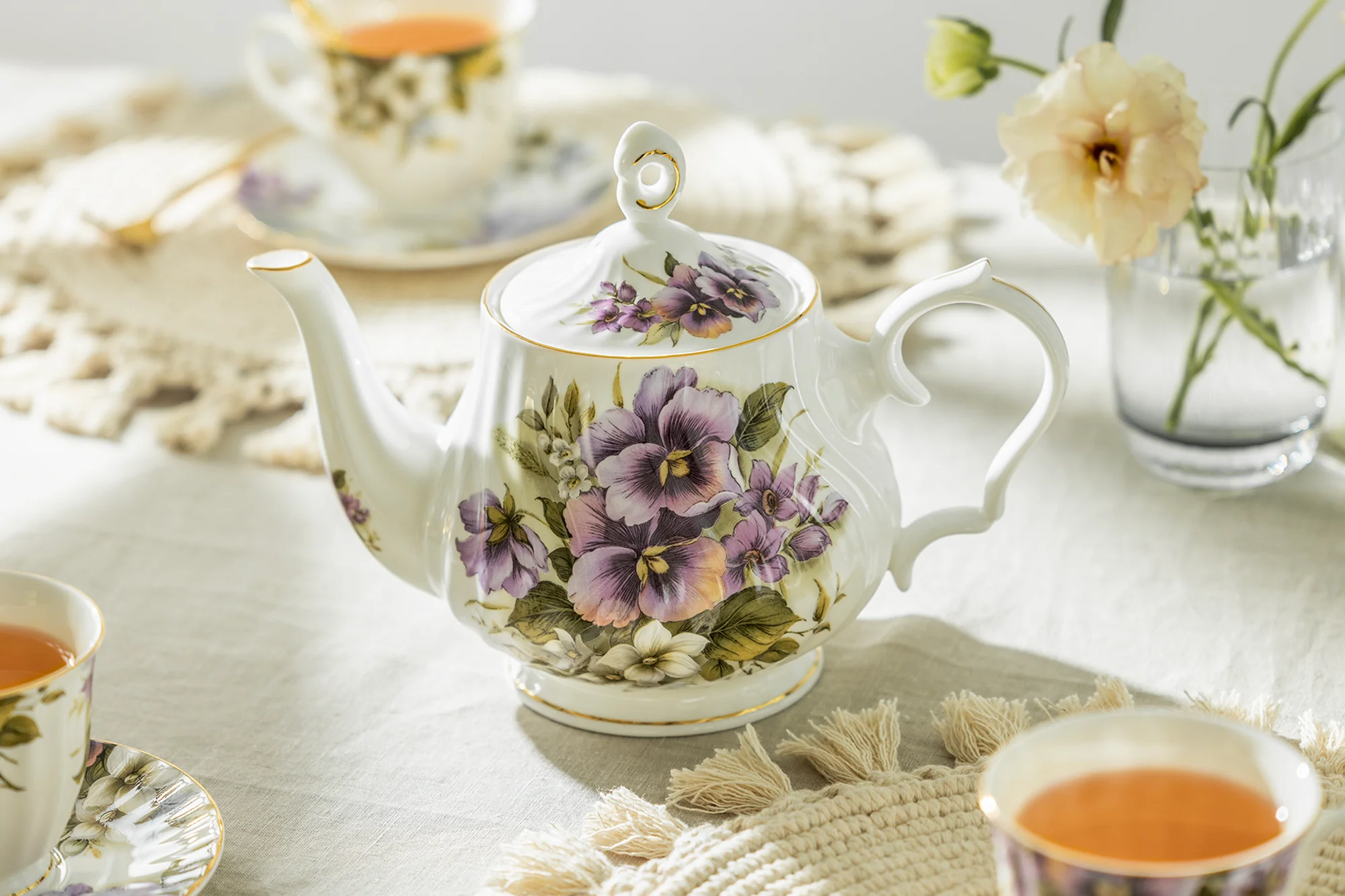 Each set includes - 1 teapot, 1 sugar bowl and 1 creamer, 4 cups with 4 saucers